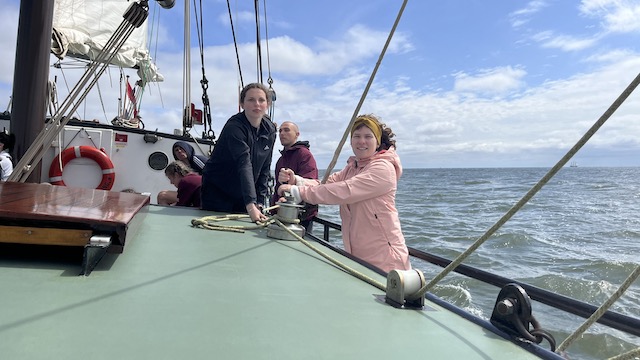 Das Segeln auf einem Plattbodenschiff erfordert die tatkräftige Mithilfe aller Teilnehmenden, damit wir unser Ziel erreichen.