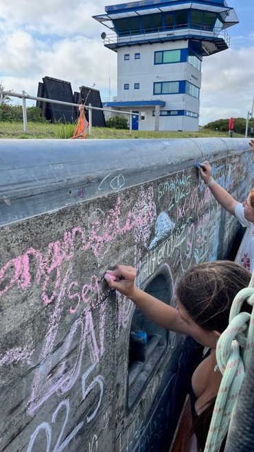 Unser erstes kleines Highlight wartete schon kurz darauf: die Schleuse. Während wir warteten, bis das Wasser stieg, haben wir kurzerhand kreativ eingegriffen – mit Kreide verschönerten wir die Schleusenwand. Ein kleiner bunter Gruß von uns für alle, die nach uns dort vorbeikommen.