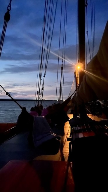 Den Tag ließen wir mit einer Andacht zum Thema Vertrauen ausklingen. Passender hätte es nicht sein können. Auf einem Schiff, das sich dem Wind und den Wellen überlässt, ist Vertrauen keine fromme Floskel – sondern ein Lebensgefühl. Wir sprachen über den Mut, sich auf Neues einzulassen, aufeinander zu bauen und gemeinsam Kurs zu halten.